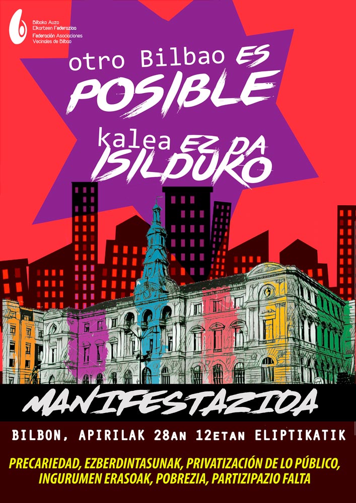 La Fedederación de Asociaciones Vecinales de Bilbao, junto con mas de un centenar de Asociaciones Vecinales y colectivos sociales que actúan en Bilbao han decidido convocar para el 28 de Abril una manifestación, que partirá de la Plaza Elíptica en dirección al Ayuntamiento.