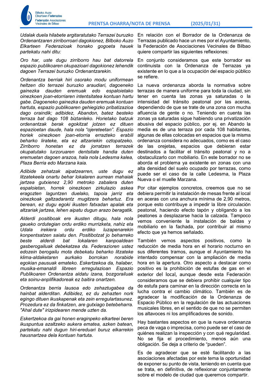 Nota de prensa de la Federación ante el borrador de la Ordenanza de Terrazas